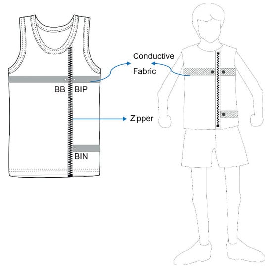 The smart clothing used fabric that combines conductive silver fibers and traditional highly elastic spandex fibers. This type of hybrid fabric minimizes the relative movement between the conductive silver fibers and the skin to optimize the signal-to-noise ratio of the data and to increases user comfort. Three metallic button electrodes were fixed in the front chest and waist in the conductive cloth to sense and acquire the data. A zipper was added in front of the smart clothing to increase the ease of wearing and removing the clothing (as shown in Figure 4). Three electrodes, labeled as BIN, BB, and BP, were designed as part of the smart cloth to transmit data, measure signals, and calculate potential changes for conversion to real-time data, respectively.