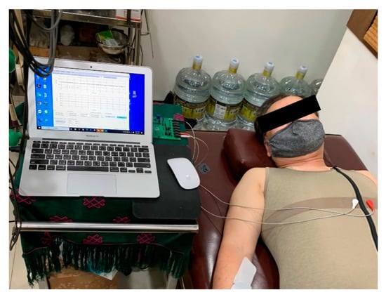 This study was conducted indoors where the temperature and relative humidity were maintained at 26 °C–28 °C and 55–65%, respectively. Subjects were required to rest for 10–15 min after entering the test environment. They were asked to lay in a supine position in a relaxed manner (Figure 5). Before beginning data acquisition, the aim and method of the test were explained to each subject. As baseline data, all subjects completed 3 min monitoring of the physiological cardiac parameters using smart clothing and 3M gel electrode patches. After this, 23,040 (128 sets × 180 s) HRm datasets were generated as test samples. After the baseline test was completed, the subjects responded to the questionnaire on the comfort of the smart clothing.