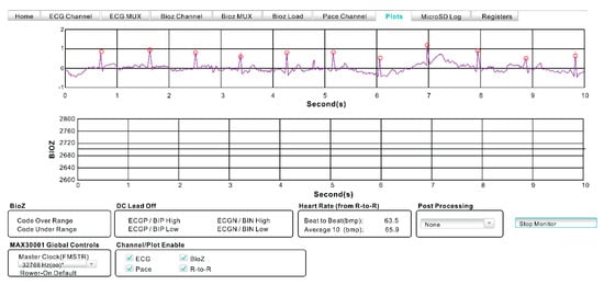 Data analysis of the 10 subjects was sampled for physiological cardiac parameters. The plot function in the Max30001 evaluation system was used to measure the number of 3 min HR intervals as 23,040 datasets (Figure 6). The data obtained after averaging is presented in Table 4. The paired-sample t-test was used to determine whether there were significant differences between smart clothing and gel electrodes (Table 5). The Bayesian paired sample t-test results of the data obtained from smart clothing and gel electrodes found no significant difference in the HR between the two methods (Bayes factor: 0.3089). The Bayes factor (<1) indicated acceptance of the null hypothesis, thus showing no significant differences.