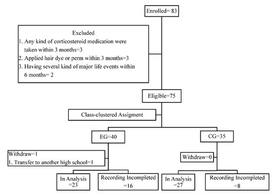 For the study, the participant inclusive criterion was having a hair length of more than 3 cm on the posterior vertex position of the head. The exclusion criteria were taking any corticosteroid medication within the past 3 months, applying hair dye or perm within the past 3 months, and/or experiencing major life events (the death or serious illness of a close relative or parents’ divorce) [31] within the past 6 months. Thereafter, the subjects were assigned to either the EG or CG.