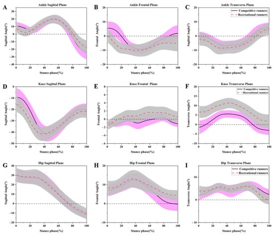 The means and standard deviations for ankle angles in (A) sagittal plane, (B) frontal plane, (C) transverse plane, knee angles in the (D) sagittal plane, (E) frontal plane, (F) transverse plane, and hip angles in the (G) sagittal plane, (H) frontal plane, (I) transverse plane during the running stance phase for the competitive runners (black, solid lines) and recreational runners (red, dashed lines).