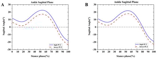 Principal components are retained for the ankle. (A) The waveform differences between competitive runners and recreational runners of reconstruction principal using the high and lower PC2-scores in the ankle sagittal plane. (B) The waveform differences between competitive runners and recreational runners of reconstruction principal using the high and lower PC3-scores in the ankle sagittal plane.
