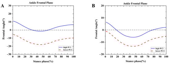 Differences were found between the competitive and recreational runners for the ankle frontal plane (Table 2 and Figure 3). For the PC1 in the frontal plane, the high waveform showed a larger inversion than the lower. The recreational runners showed negative principal PC1 in Figure 3A and Table 2 (p = 0.001). Therefore, the recreational runners exhibited a smaller inversion angle than the competitive runners during the running stance. In addition, high PC2 indicated range of motion changes during the running stance phase. The competitive runners showed negative PC2 in Figure 3B and Table 2 (p = 0.001). The competitive runners exhibited a smaller ROM than the recreational runners during the running stance in the ankle frontal plane.