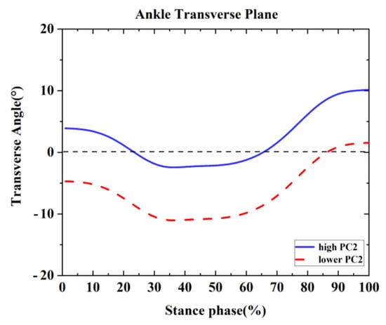 Principal components are retained for the ankle. The waveform differences between competitive runners and recreational runners of reconstruction principal using the high and lower PC2-scores in the ankle transverse plane.