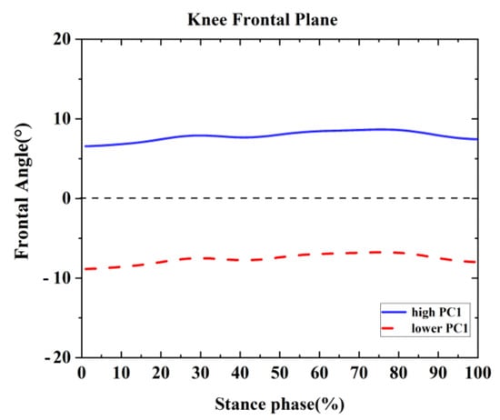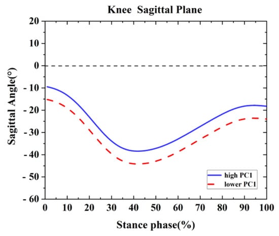 One difference was found between the competitive and recreational runners for the knee sagittal plane (Table 2 and Figure 5). For the PC1 in the knee sagittal plane, the high waveform showed larger flexion than the lower. The recreational runners showed larger principal PC1 in Figure 3A and Table 2 (p = 0.001). Therefore, the recreational runners exhibited a larger knee flexion angle than the competitive runners during the running stance.