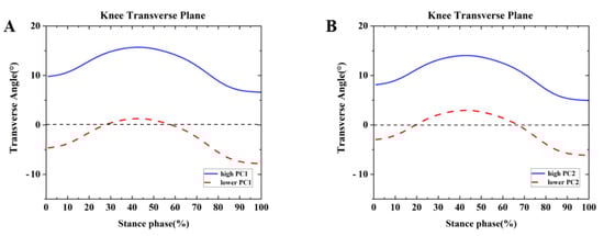 Differences were found between the competitive and recreational runners for the ankle frontal plane (Table 2 and Figure 7. For the PC1 in the transverse plane, the high waveform showed larger internal rotation than the lower. The recreational runners showed positive principal PC1 in Figure 7A and Table 2 (p = 0.001). Therefore, the recreational runners exhibited a greater internal rotation angle than the competitive runners during the running stance. In addition, high PC2 indicated range of motion changes during the running stance phase. The competitive runners showed negative PC2 in Figure 7B and Table 2 (p = 0.001). The competitive runners exhibited greater ROM than the recreational runners during the running stance in the knee transverse plane.