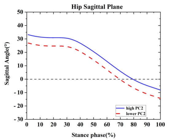 Principal components are retained for the hip. The waveform differences between competitive runners and recreational runners of reconstruction principal using the high and lower PC2-scores in the sagittal plane.