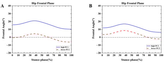 Differences were found between the competitive and recreational runners for the hip frontal plane (Table 2 and Figure 9). For the PC1 in the frontal plane, the high waveform showed larger adduction than the lower. The recreational runners showed positive principal PC1 in Figure 9A and Table 2 (p = 0.001). Therefore, the recreational runners exhibited a greater adduction angle than the competitive runners during the running stance. In addition, high PC2 indicated the range of motion changes during the running stance phase. The recreational runners showed negative PC2 in Figure 9B and Table 2 (p = 0.001). Thus, the competitive runners exhibited greater ROM than the recreational runners during the running stance in the hip frontal plane.