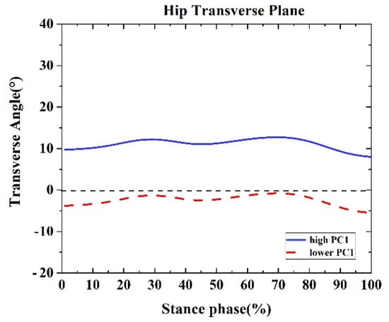 One difference was found between the competitive and recreational runners for the hip transverse plane (Table 2 and Figure 10). For PC1 in the hip transverse plane, the high waveform showed a larger internal rotation than the lower. The recreational runners showed negative principal PC1 in Figure 10 and Table 2 (p = 0.001). Therefore, the recreational runners exhibited less hip internal rotation angle than the competitive runners during the running stance.