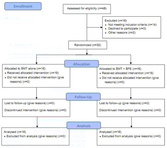 All participants were randomly assigned to two intervention groups (SMT alone or SMT combined with SFE). Sixteen cards, marked “A” for the SMT combined with SFE, and another sixteen cards, marked ‘B’ for the SMT alone, were placed in an opaque envelope and drawn by the participants. An investigator who was not involved in the interventions assigned the participants to random groups.