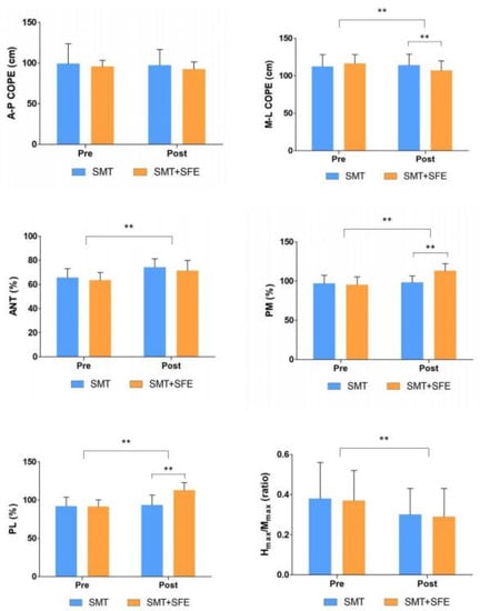 There was no significant group-by-time interaction effect on the A–P COPE change for static balance (F = 0.250, p = 0.621). However, there were significant differences in the main effect of time (F = 5.388, p = 0.027) and group-by-time interaction effect (F = 11.234, p < 0.05) on the M–L COPE change (Table 3). Post-hoc analysis showed that M–L COPE significantly decreased in the SMT combined with SFE group compared with in the SMT alone group (p < 0.01) (Figure 3).