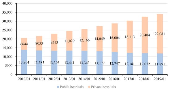 Comparable to reserve requirements that ensure bank liquidity and solvency, the viability and stability of China’s health care system rests on minimum resource levels. Before the COVID-19 outbreak, China and Wuhan’s medical resources were barely sufficient to cover normal demand. Inadequate long-run medical resources were due to inadequate investment in hospitals and the misallocation of existing health care resources between hospital tiers and urban-rural locations, reflecting a failure in hospital regulation. Figure 1 shows that the increase in the supply of hospitals in China relied on the increase in the number of private hospitals, with the number of public hospitals declining. At the end of 2017, China had 4.34 hospital beds per 1000 people, which was significantly less than Japan (13.05 beds per 1000 people), South Korea (12.27 beds per 1000 people), Russia (8.05 beds per 1000 people) and Germany (8 beds per 1000 people) [42]. Between 1978 and 2018, the growth in the number of hospital beds in China increased 3.5 times, significantly slower than the growth of China’s economy at nearly 250 times in the same period [43]. Shortages of hospitals occurred alongside a shortage of medical workers, especially nurses. As shown in Table 1 for the 2007–2016 period, China averaged 1.8 doctors and 2.3 nurses and midwives per 1000 people, with a ratio of 1 doctor to 1.28 nurses that was significantly lower than that of developed countries. While China had increased licensed physicians to 2.16 per 1000 people and registered nurses to 2.94 per 1000 people by 2018, the ratio of medical staff to nurses was only 1:1.14, with primary health facilities, especially in rural areas, especially under-resourced relative to tier 2 and tertiary hospitals [44].