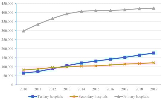 Like banks, pre-COVID-19 tertiary hospitals in China displayed moral hazard behavior when imperfect information meant patients could not accurately assess the stability and long-run resource quality of hospitals in the tiered hospital system. Relying on their top-grade healthcare staff and equipment, profit-oriented tertiary hospitals “siphoned-off” patients from smaller hospitals and primary health centers, which exacerbated the shortages in medical resources through the over-use of medical resources at higher-level hospitals, and under-use of resources at lower-level hospitals [45,46]. In addition, the health insurance schemes made it easier for tertiary hospitals to “siphon-off” patients. This is because the health insurance schemes have improved patients’ ability to pay for expensive health services, and more patients were willing to enjoy tertiary hospitals rather than primary care facilities [47]. The existing Chinese public insurance policies also exacerbated moral hazard by patients. After China’s health care reform, higher coverage led to an increase in total health care consumption [48]. The increase in China’s health care medical expenses was partly due to “unnecessary” utilization of health care services by insured patients, who choose higher level hospital rather than primary health care treatment [49]. Figure 2 shows that the number of patients in tertiary hospitals rapidly increased since 2010, while the growth rate of patients in secondary hospitals and primary care facilities stagnated.