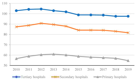 Moral hazard bank behavior leads to unbalanced long-run bank asset portfolios. Asymmetric information explained a failure in hospital regulation, which allowed medical resources to be unbalanced. The misallocation of medical resources, with most advanced medical technology, equipment and expert medical teams concentrated in tertiary hospitals, created long-term unbalanced medical resource portfolios across the primary care, secondary and tertiary systems and exacerbated the shortages in medical resources, compounding any run on the hospital system. The utilization rate of hospital beds in Figure 3 shows that tertiary hospitals operated at full capacity, significantly higher than the operating capacity of secondary and primary care facilities. During the pandemic, hospitals expanded the number of beds, built temporary hospitals and tried to allocate patients to the appropriate hospital tier for treatment [55]. However, the shortage of medical experts, outdated equipment and low diagnosis and treatment technology meant secondary and primary hospitals did not have the capacity to absorb the significantly greater additional health care demand during the pandemic. As a result, measures to force patients to visit lower health tiers during the pandemic were constrained [56,57,58].