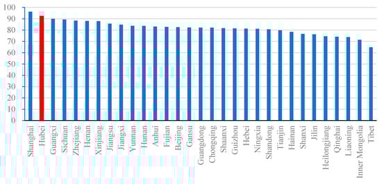 Utilization rate of hospital beds in 31 provinces in Mainland China in 2019 (%). Note: The bar in red shows the condition of Hubei, and the other bars are in blue. Data: National Health Commission of the PRC.