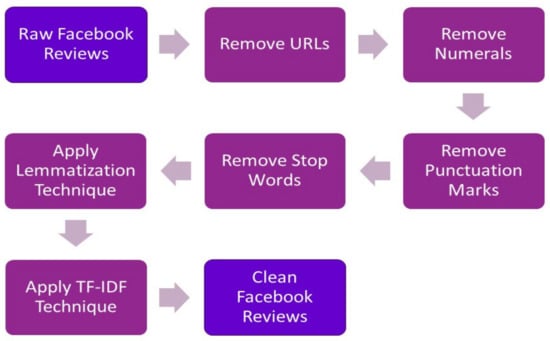 The machine learning technique analysed the characteristics of the individual phrases used in the Facebook reviews, and used this data to build a topic classifier. First, the labeled dataset was pre-processed to remove URLs, numerals, punctuation marks, stop words and simplifying words using a lemmatization technique (e.g., treating as a treat). Following that, the weights of terms were calculated using the term frequency-inverse document frequency (TF-IDF) approach, which demonstrated their significance to the documents and corpus. Figure 1 explains the Natural Language Processing (NLP) techniques used in the text preprocessing phase.