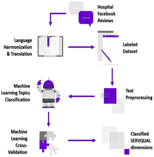 However, the unstructured nature of POR data collected from social media presents several difficulties, including data cleaning and processing. While this may be accomplished manually via human input, the process is lengthy, and the method’s validity and reliability are often questioned [29]. A systematic evaluation of POR was proposed to accelerate the processing of large-scale online data review using sophisticated analytical techniques such as machine learning [16]. Consequently, a machine learning approach for classifying service quality themes or subjects based on unstructured social media data has the potential to significantly improve healthcare quality of care [30,31].