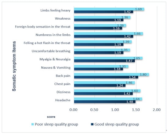 Except for foreign body sensation in the throat, all somatic symptoms significantly differed between the two groups (p-value, 0.000–0.031). The most common symptom was low back pain, with a score of 1.54 in the good sleep quality group and 1.80 in the poor sleep quality group. The second most common symptom was heaviness in the legs, with a score of 1.42 in the good sleep quality group and 1.42 in the poor sleep quality group. Having a foreign body sensation in the throat was the least common symptom in both groups, with no significant difference between the two groups (p = 0.088) (Figure 1).