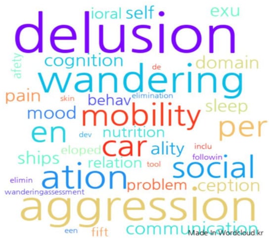 Cloud analysis of the most difficult mental behaviors of dementia patients (Wordclound.kr accessed on 3 December 2020).
