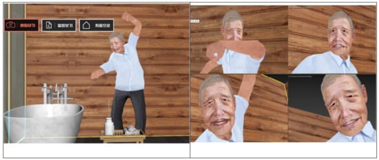 To implement the case of the dementia patient’s aggressive behavior developed in this study into virtual reality, the character, facial expression, and aggressive behavior pattern of the dementia patient were selected through a meeting with a virtual reality implementation company. In addition, voices and situational backgrounds were selected through several discussions. Considering the age of the subjects of this study, the cases in which virtual reality can be experienced were composed of a total of 4 min and 30 s (Appendix A). The start of the virtual reality practice program enabled the first definition of the psycho-behavioral symptoms of dementia patients, and the psycho-behavioral symptoms to be experienced in this study were specified. After this, a grandfather with a cane appeared in the background of the bathroom for bathing, and the situation of taking the grandfather to the bathroom was realized. When a subject tried to take the grandfather to the bath, the grandfather swung his arms back and forth and swung his cane, and it was constructed to express refusal such as ‘Go away! Don’t do it!’, see Figure 2. The VR implemented in this study was developed through HTC’s Vive Pro, and at least two base stations and a vive controller were used for user tracking.