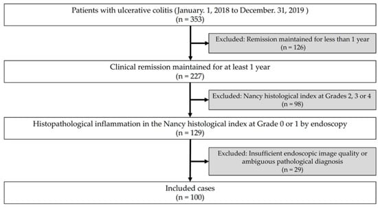From the medical chart database, among 353 patients treated for UC at the Department of Gastroenterology of Dokkyo Medical University Hospital from 1 January 2018 to 31 December 2019, data of patients that maintained clinical remission for at least 1 year (clinical remission was defined as a partial Mayo score of 3 points or lower [8], excluding 126 cases for which remission was maintained for less than 1 year), and of patients who were judged as Grade 0 or 1 of the Nancy histological index [19] of histopathological inflammation from periodic endoscopy (excluding 98 cases with Grade 2, 3 or 4 of Nancy histological index), were extracted to collect colonoscopic images at the time of pathological diagnosis. Pathological examinations were performed by two pathologists who specialized in pathology of gastrointestinal diseases. The degree of inflammation was assessed using the Nancy histological index based on the agreement of those two pathologists. From those cases, 29 cases judged by the principal investigator as having an endoscopic poor quality image and ambiguous pathological diagnosis were excluded. Therefore, 100 patients were selected for this study (Figure 1). For those 100 investigated cases, the clearest image was selected by MK for each case from endoscopic images of the site where the histopathological biopsy was conducted. The cases were selected by MK; 100 images were presented to the observer endoscopists without patient information. Therefore, the observer endoscopists were unable to obtain information related to histologic activity to exclude bias from the endoscopic evaluation. Additionally, MK was not included among the observers in this study.