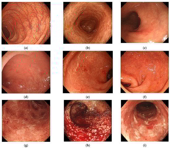 Endoscopic findings in Mayo endoscopic subscore: (a) normal, (b) inactive disease, (c) erythema, (d) decreased vascular pattern, (e) marked erythema, (f) absent vascular pattern, (g) erosions, (h) spontaneous bleeding, and (i) ulceration.