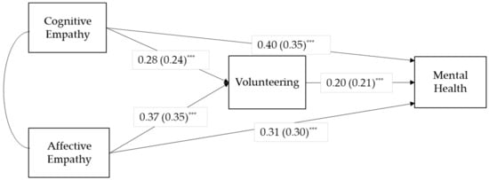 (1) Background: Empathy affects an individual’s decision to participate in volunteering, and volunteering, in turn, influences mental health. Intriguingly, studies have been limited in exploring underlying mechanisms and boundary conditions for the relationship between empathy and mental health. Furthermore, volunteering studies have overlooked the multi-dimensionality of empathy. Therefore, this study seeks to contribute to extant literature by investigating the mediating effect of volunteering for the relationships between cognitive and affective empathy and mental health and the moderating effect of gender for the relationship between empathy and volunteering. (2) Methods; Data were collected using a survey in South Korea and consisted of 301 full-time employees who voluntarily engaged in their corporate volunteer programs. Furthermore, they voluntarily participated in the study. The hypotheses were tested with path analysis and a group comparison was also conducted. (3) Results: Volunteering was found to mediate the relationships between cognitive empathy and affective empathy with mental health. In addition, gender moderated the relationship between empathy and volunteering. (4) Conclusions: As the study found empathy to increase individuals’ engaging in volunteering activities which then improved mental health, the study supports extant theoretical frameworks on empathy and volunteering. Moreover, the study found gender differences on empathy and volunteering; thereby supporting and contributing to extant literature.