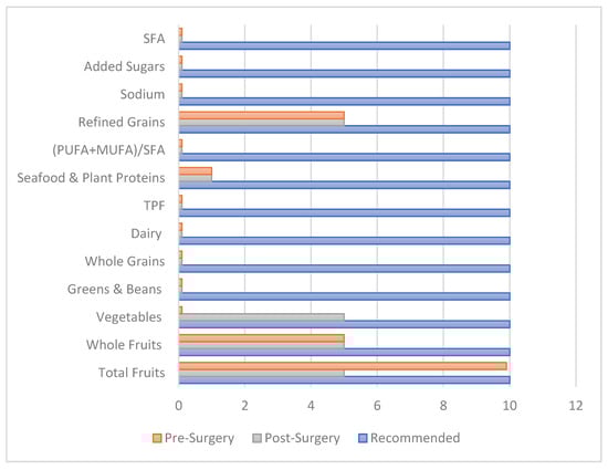 On the assessment day, participants were asked to provide a two-day food intake record pre-surgery and another one post-surgery. In these food records, patients were asked to report all the food and beverage items they consumed in a typical weekday and weekend day. The mean of both days represented the participant’s intake preoperatively and postoperatively. These records were transformed into exchanges of food groups and then analyzed to estimate total calories, percentage of saturated fatty acids (SFA), mono-unsaturated fatty acids (MUFA), and poly-unsaturated fatty acids (PUFA), as well as sodium intake and to estimate the score of the HEI components. The HEI 2015 is a measure of diet quality in terms of conformance with the 2015–2020 edition of the Dietary Guidelines for Americans (DGAs) [36]. The 2015–2020 DGAs encourage the consumption of nutrient-dense foods and the reduction of the consumption of refined grains, added sugars, sodium and SFA; higher HEI scores reflect better diet quality. Higher scores are given for increased consumption of total fruits, whole fruits, total vegetables, greens and beans, whole grains, dairy, total-protein food, seafood and plant proteins, fatty acids and for a reduced intake of refined grains, sodium, added sugars and SFA. We followed the simple HEI scoring algorithm method [37]. Each component was analyzed per 1000 calories to provide a relative, rather than absolute, indication of nutrient intake. Fatty acids intake was evaluated using the ratio of unsaturated to saturated fatty acids. The total HEI score was categorized based on numerical scores as follows: 90–100%, Grade A; 80–89%, Grade B; 70–79%, Grade C; 60–69%, Grade D; and 0–59%, Grade F, with grade A reflecting the best diet quality and grade F the worst [36].