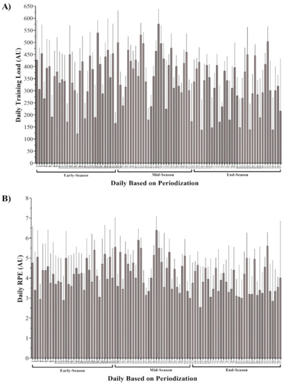 Fluctuations in session training load (A) and rating of perceived exertion (RPE, B) over the season.
