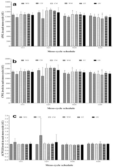 wAWL (a), wCWL (b), and wACWLR (c) patterns over periods and playing (field) positions and whole team. WD, wide defenders; WM, wide midfielders; CD, central defenders; CM, central midfielders; ST, strikers; OV, whole team; AWL, weekly acute workload; CWL, weekly chronic workload; ACWLR, weekly acute to chronic workload ratio. * Represents a statistically significant difference compared with Ear-S (p ≤ 0.05); Represents a statistically significant difference compared with Mid-S (p ≤ 0.05). # Significant differences between two playing positions in the same period of the season (p ≤ 0.05).