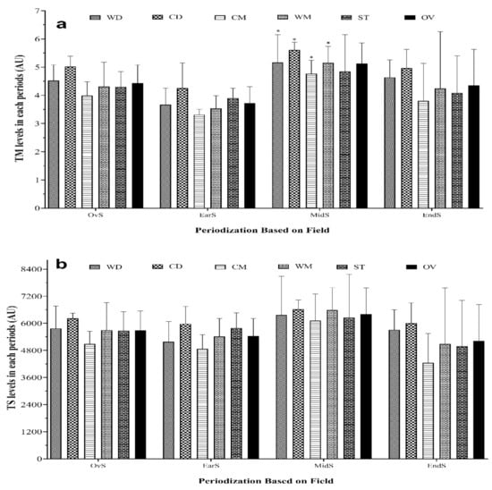 wTM (a) and wTS (b) patterns over periods and playing (field) positions and the whole team. WD, wide defenders; WM, wide midfielders; CD, central defenders; CM, central midfielders; ST, strikers; OV, whole team; TM, weekly training monotony; TS, weekly training strain. * Represents a statistically significant difference compared with Ear-S (p ≤ 0.05); Represents a statistically significant difference compared with Mid-S (p ≤ 0.05).