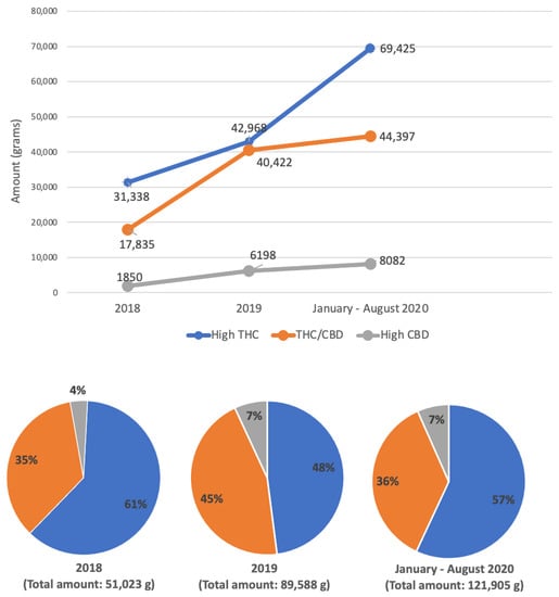 By going into detail, taking into account the different types of products in the three considered periods, the amounts of acquired cannabis were: 31,338 g (6%), 42,968 g (48%) and 69,425 g (57%) for cannabis with a high THC content; 17,835 g (35%), 40,422 g (45%) and 44,397 g (36%) for cannabis with similar THC and CBD content; 1850 g (4%), 6198 g (7%) and 8082 g (7%) for cannabis with high CBD content.