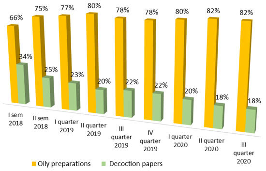 Distribution percentage of oily preparations and decoction papers, dispensed in Ligurian Region by the hospital pharmacist.