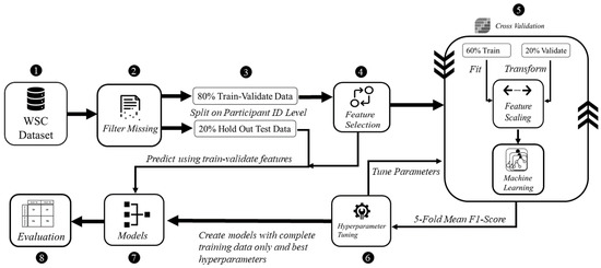 As shown in Figure 1, the proposed methodology composes of the following five steps: (i) preprocessing, (ii) feature selection, (iii) model development, (iv) hyperparameter tuning and (v) evaluation. This process is conducted for the EHR as well as for the physiological parameters acquired from the same population in the WSC dataset.