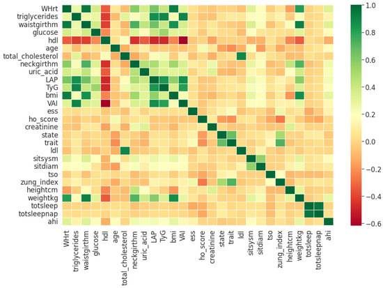 OSA is a multi-factorial condition, as it can manifest alongside patients with other conditions such as metabolic, cardiovascular, and mental health disorders. Blood biomarkers can therefore be indicative of the condition or a closely associated co-morbidity, such as heart disease and metabolic dysregulation. These biomarkers include fasting plasma glucose, triglycerides, and uric acid [27]. The presence of one or the other comorbidities does not always necessarily indicate OSA, however in recent literature clinical surrogate markers reflective of particular conditions have shown considerable association with suspected OSA. Clinical surrogate markers exhibit more sensitive responses to minor changes in patient pathophysiology, and are generally more cost-effective to measure than complete laboratory analysis [28]. Thus, we derive 4 markers, Triglyceride glucose (TyG) index, Lipid Accumulation Product (LAP), Visceral Adipose Index (VAI) and the Waist-Height Ratio (WHrt), and observe their value in discriminating between OSA and non-OSA patients [29]. Ref. [30] reports LAP, VAI and TyG were reliable surrogate markers for identifying metabolic syndrome in middle-aged and elderly Chinese population. TyG was independently associated with increased OSA risk, as it is a reliable marker of insulin resistance, comprising of glucose intolerance, dyslipidemia, and hypertension [31]. This relationship is observed as insulin resistance increases due to the intermittent periods of asphyxia, hypoxia and sleep depivation caused due to OSA [32].