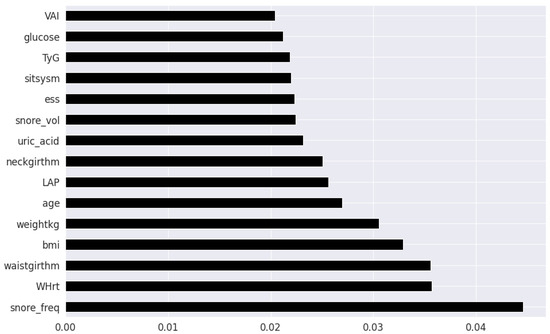 The final feature set in the top two-features per method consisted of a total of 8 features: waist circumference, neck circumference, daily snoring frequency, snoring volume, EDS, BMI, Whrt, and weight. The final features in the top twenty-feature per method consisted of the following 11 features in addition to the previous 8 features: fasting plasma glucose, LAP, uric acid, VAI, hypertension, heart attack comorbidity, TyG, triglycerides, systolic blood pressure and age.