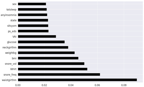 Waist, neck circumference and EDS have been long established as vital indicators for OSA susceptibility, and results of feature selection methods are in agreement. It is important to note that abdominal obesity is not the same as peripheral obesity. Waist circumference depends on the fatty tissues in the peritoneum, and thus, the abdominal obesity, which is known to affect upper airway functioning, a consistent symptom of OSA [62].
