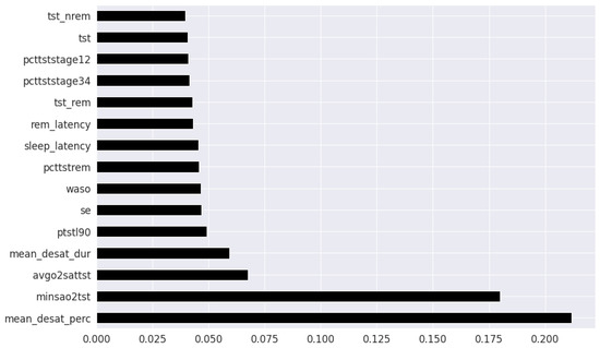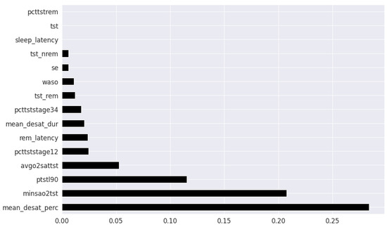 The final feature set in the top two-features per method derived from oximetry consisted of a total of two features: mean oxygen desaturation percentage, and minimum level of oxygen saturation. The final feature set in the top fifteen-features per method derived from oximetry c in the top fifteen features consisted of the following 4 features in addition to the previous 2 features: sleep duration with oxygen saturation percentage below 90%, REM sleep latency, average oxygen desaturation of apnea-hypopnea event and mean oxygen desaturation duration.