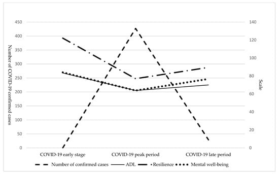 Number of confirmed COVID-19 cases in Taiwan and activities of daily living, mental well-being, and resilience for the different outbreak periods. At the peak of the outbreak, the activities of daily living, mental well-being, and resilience were significantly lower than during the early and late periods. Correlation analysis confirmed significant negative relationships between the number of COVID-19 cases and the resilience scale (r = −0.378, p < 0.001), mental well-being scale (r = −0.438, p < 0.001), and activities of daily living (r = −0.177, p = 0.04). ADL, activities of daily living.