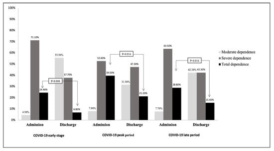 Among the three periods, the percentage (39.5%) of patients who were totally dependent at admission was highest during the peak period of the COVID-19 outbreak in Taiwan compared to the early stage (24.4%) and late period (28.8%). Compared with the number of patients who were totally dependent at admission, fewer patients were totally dependent at discharge, regardless of the period of the COVID-19 outbreak (all, p < 0.05, Figure 2). However, the percentage (21.2%) of patients who were totally dependent at discharge was still the highest during the COVID-19 peak period compared to the early stage (6.8%) and late period (15.4%). This showed that the activities of daily living of the patients were correlated with the different stages of the COVID-19 outbreak in Taiwan.
