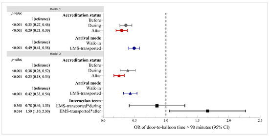 After adding the interaction term between accreditation status and arrival by EMS, the negative associations between ‘after accreditation’ status and in-hospital delay remained statistically significant and had larger coefficient sizes in the likelihood of door-to-balloon time being more than 90 min (OR: 0.25, 95% CI: 0.18, 0.34) and the door-to-balloon time (β: −32.90, 95% CI: −42.98, −22.90). In terms of differences in arrival mode, the coefficient sizes of arrival by EMS were also larger in the in-hospital delay: the likelihood of door-to-balloon time being more than 90 min (OR: 0.42, 95% CI: 0.33, 0.54) and the door-to-balloon time (β: −30.40, 95% CI: −38.77, −22.22).