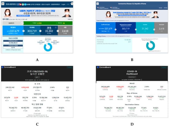 Homepages of the two dashboards in Korean (left) and English (right) for South Korea: (A) Coronavirus Disease-19, Republic of Korea. Center Disaster Management Headquarters. Center Disease Control Headquarters. URL: http://ncov.mohw.go.kr/ (In Korean, accessed on 14 October 2021) [40]; (B) Coronavirus Disease-19, Republic of Korea. Center Disaster Management Headquarters. Center Disease Control Headquarters. URL: http://ncov.mohw.go.kr/en/ (In English, accessed on 14 October 2021); (C) COVID-19 Dashboard in South Korea. Korea Disease Control and Prevention Agency. URL: https://coronaboard.kr/ (In Korean, accessed on 15 October 2021) [41]; (D) COVID-19 Dashboard in South Korea. Korea Disease Control and Prevention Agency. URL: https://coronaboard.kr/en/ (In English, accessed on 14 October 2021).
