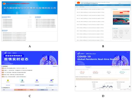 Homepages of the two dashboards in Chinese (left) and English (right) for China. (A) COVID-19 Prevention and Control. National Health Commission of the People’s Republic of China. URL: http://www.nhc.gov.cn/xcs/yqfkdt/gzbd_index.shtml (In Chinese, accessed on 14 October 2021) [42]; (B) Daily Briefing on Novel Coronavirus Cases in China. National Health Commission of the People’s Republic of China. URL: http://en.nhc.gov.cn/DailyBriefing.html (In English, accessed on 14 October 2021); (C) COVID-19 Global Pandemic Real-time Report. DXY, DX Doctor. URL: https://ncov.dxy.cn/ncovh5/view/pneumonia?from=dxy&source=&link=&share= (In Chinese, accessed on 14 October 2021) [43]; (D) COVID-19 Global Pandemic Real-time Report. DXY, DX Doctor. URL: https://ncov.dxy.cn/ncovh5/view/en_pneumonia?from=dxy&source=&link=&share= (In English, accessed on 14 October 2021).
