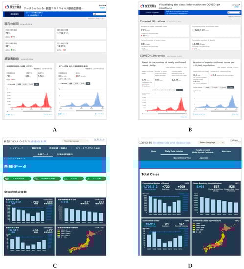 Homepages of the two dashboards in Japanese (left) and English (right) for Japan. (A) COVID-19 trends. Japan Ministry of Health Labor and Welfare. URL: https://covid19.mhlw.go.jp/extensions/public/index.html (In Japanese, accessed on 14 October 2021) [44]; (B) COVID-19 trends. Japan Ministry of Health Labor and Welfare. URL: https://covid19.mhlw.go.jp/extensions/public/en/index.html (In English, accessed on 14 October 2021); (C) COVID-19 Information and Resources. Office for Novel Coronavirus Disease Control, Cabinet Secretariat, Government of Japan. URL: https://corona.go.jp/dashboard/ (In Japanese, accessed on 14 October 2021) [45]; (D) COVID-19 Information and Resources. Office for Novel Coronavirus Disease Control, Cabinet Secretariat, Government of Japan. URL: https://corona.go.jp/en/dashboard/ (In English, accessed on 14 October 2021).