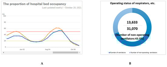 Healthcare information provided on the Japanese COVID-19 dashboards. (A): The proportion of hospital bed occupancy. (Note: Orange line: The proportion of the hospital bed occupancy for COVID-19, defined as the number of hospital beds used by COVID-19 cases divided by total hospital beds for COVID-19; Blue line: the proportion of the hospital bed occupancy for severe COVID-19, defined as the number of beds used by severe COVID-19 cases divided by total hospital beds for severe COVID-19) Source: Information on COVID-19 Infections. Japan Ministry of Health Labor and Welfare. https://covid19.mhlw.go.jp/extensions/public/en/index2.html (accessed on 30 October 2021) [44]; (B): Operational status of ventilators. Source: COVID-19 Information and Resources. Cabinet Secretariat, Government of Japan. https://corona.go.jp/dashboard/ (accessed on 14 October 2021) [45].