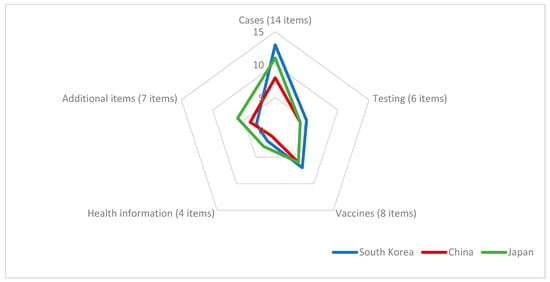 Figure 5 presents an overview of the performance of information disclosure on the COVID-19 dashboard in South Korea, China, and Japan using a radar chart. To assess COVID-19 information disclosure, the checklist for the COVID-19 dashboard website’s structure consisted of 39 items in five categories (cases, testing, vaccines, health information, and additional items). Generally, South Korea did well in cases, testing, and vaccines, and Japan did well in both health information and additional items.