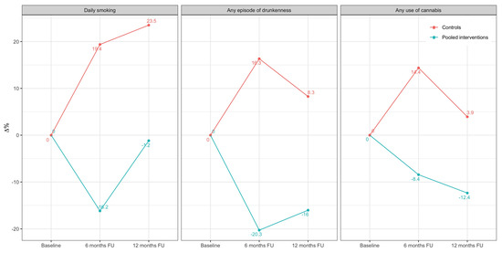 - Faggiano, F.; Vigna-Taglianti, F.; Burkhart, G.; Bohrn, K.; Cuomo, L.; Gregori, D.; Van der Kreeft, P. The effectiveness of a school-based substance abuse prevention program: 18-month follow-up of the EU-Dap cluster randomized controlled trial. Drug Alcohol Depend. 2010, 108, 56–64. [Google Scholar] [CrossRef] [PubMed]