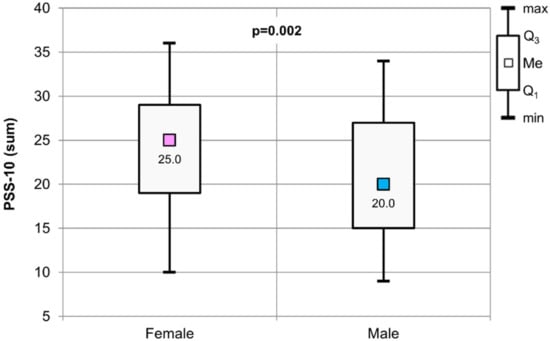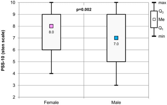 The results of the Mann–Whitney test used to assess the significance of the differences in values for the PSS-10 scale from the point of view of gender of the surveyed students are presented in Figure 1. Women were characterized with a significantly higher perceived stress level than men (p = 0.002).