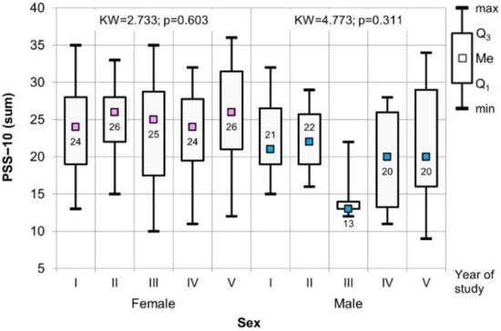 Figure 3. Results of the Kruskal–Wallis test used to assess the significance of difference values for the PSS-10 (sum) scale in relation to gender of respondents and year of study.