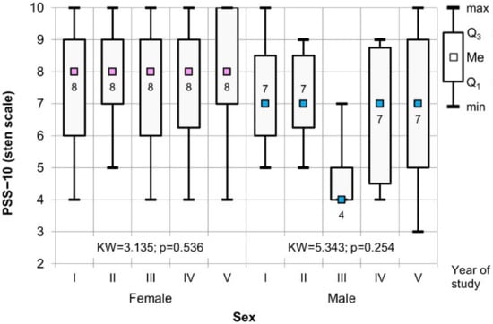 The comparative analysis, considering the gender of the respondents and the year of study using the Kruskal–Wallis test, did not show statistically significant differences between the individual years of study, both in the case of the PSS-10 and the sten scale (Figure 3 and Figure 4).